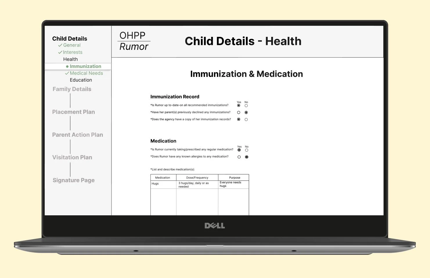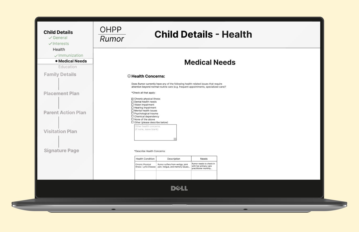 SSIS (Social Services Info System) is a program/job tool caseworkers for the Department of Human Services (DHS) use to create plans (OHPPs) for children who need to be temporarily or permanently removed from their homes for the purpose of maintaining their safety and wellbeing. According to our research, the program is disorganized and full of redundancy, causing issues for both caseworkers and anyone receiving an OHPP. Additionally, the UI has not been updated since the late 90’s when it was created.